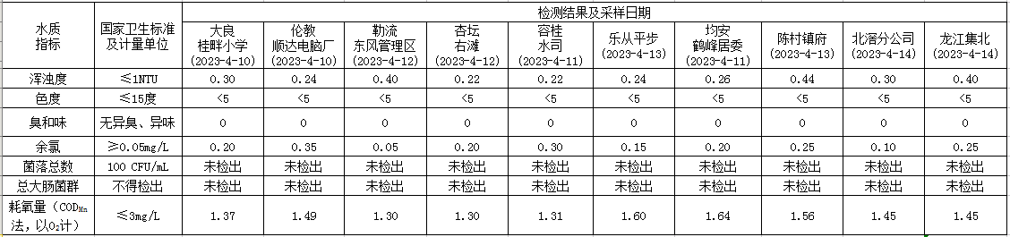 一、出厂水9项水质情况(采样日期:2023年4月14日)